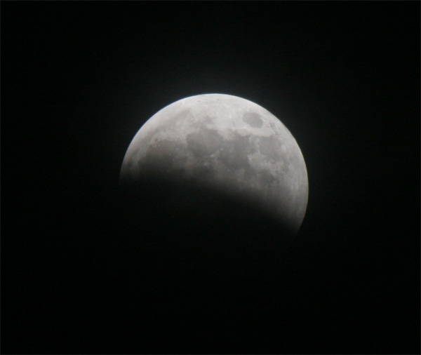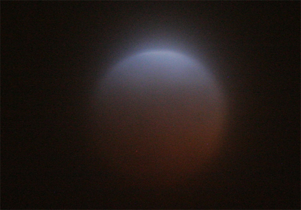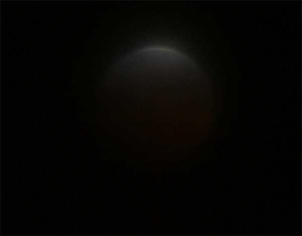 Hier muss schon recht lange belichtet werden, damit dieser letzte helle Streifen auf der Mondoberfläche noch zur Geltung kommt. Kurz danach war der Mond mit bloßem Auge nicht mehr zusehen. Sollte dies alles gewesen sein? Wo war der "rote" Mond, der sonst zu einer Mondfinsternis gehört? Durch die vielen Wolken war jetzt aber auch kein Stern mehr zu sehen. Ich wollte meine kamera schon abbauen, da dachte ich mir, naja, ein letztes Foto, quasi "ins Blaue" oder besser ins dunkle der Nacht hinein kostet Dich schließlich dank digitaler Technik doch keinen Cent. Also abgedrückt! Und hier ist das Ergebnis: