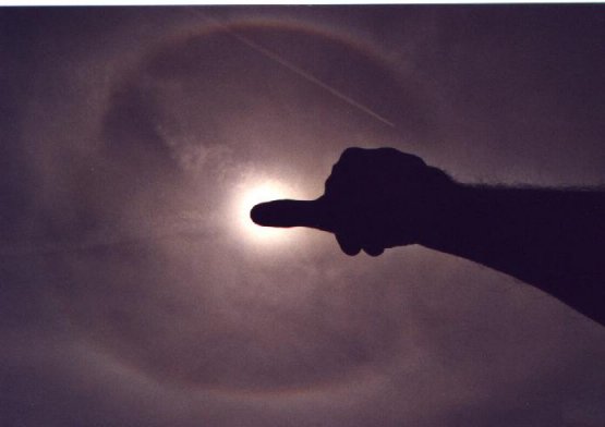 Noch mehr überascht war ich, als ich den Kopf stärker gegen Westen drehte. "Da ist doch noch so eine Art 'Halo-Streifen' zu erkennen", ging es mir durch den Kopf. Und in der Tat: zwar deutlich schwächer als der 22°-Ring, aber doch noch klar zu erkennen. Auf dem Foto, dank der elektronischen Kontrastverstärkung, vielleicht schon etwas stärker als in Wirklichkeit zu erkennen. Aber ein Blick in meine "Lieblingszeitschrift" brachte Gewissheit: Eine ausführliche Beschreibung dieser Halo-Phänomene erschien genau in diesem Monat (Mai 2002) in der Zeitschrift "Sterne und Weltraum". (Artikel: "Halos und irisierende Wolken")